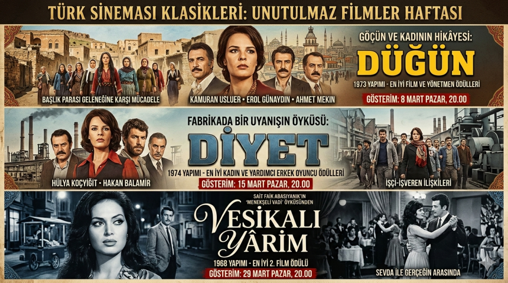 Üçlemenin son filmi olan 1974 yapımı dram türündeki Diyet filminin oyuncu kadrosunda Hülya Koçyiğit, Hakan Balamir, Erol Taş ve Erol Günaydın yer alıyor. Bir fabrika ve çevresinde gelişen işçi-işveren ilişkilerinin beyaz perdeye yansıtıldığı film, 1975 Antalya Altın Portakal Film Festivali’nde Hülya Koçyiğit’e En İyi Kadın Oyuncu Ödülü’nü ve Erol Taş’a En İyi Yardımcı Erkek Oyuncu Ödülü’nü kazandırdı. Film, 15 Mart Pazar saat 20.00’de gösterilecek.