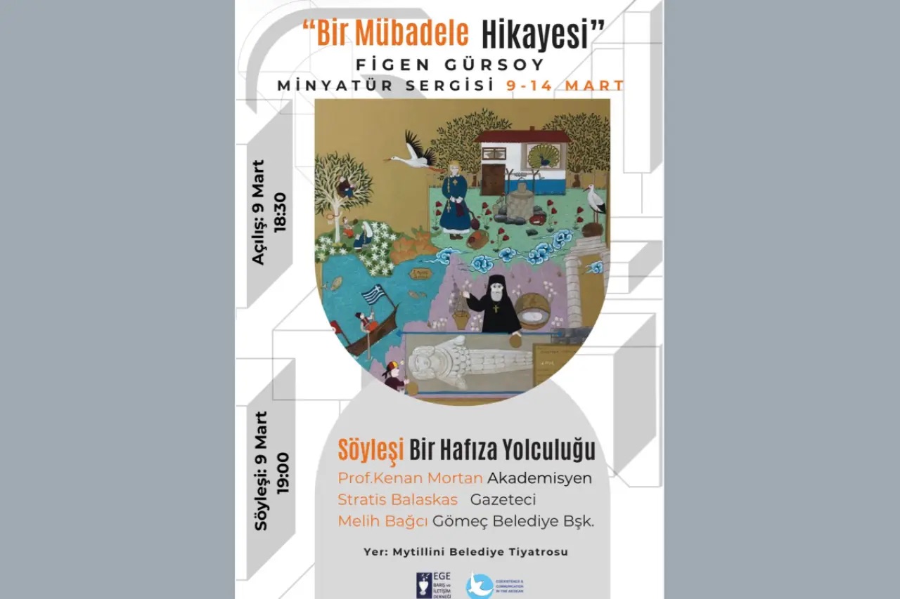 Mübadele öykülerini konu alan Türk ve Yunan yazarların eserlerinden ilham alan sanatçı Figen Gürsoy’un minyatür çalışmaları, 9–14 Mart 2026 tarihleri arasında Midilli Belediye Tiyatrosu’nun fuaye alanında sergilenecek. Etkinlik programı kapsamında ayrıca mübadele üzerine bir söyleşi de gerçekleştirilecek. Söyleşiye Kenan Mortan, gazeteci Stratis Balaskas ve Melih Bağcı katılacak.
