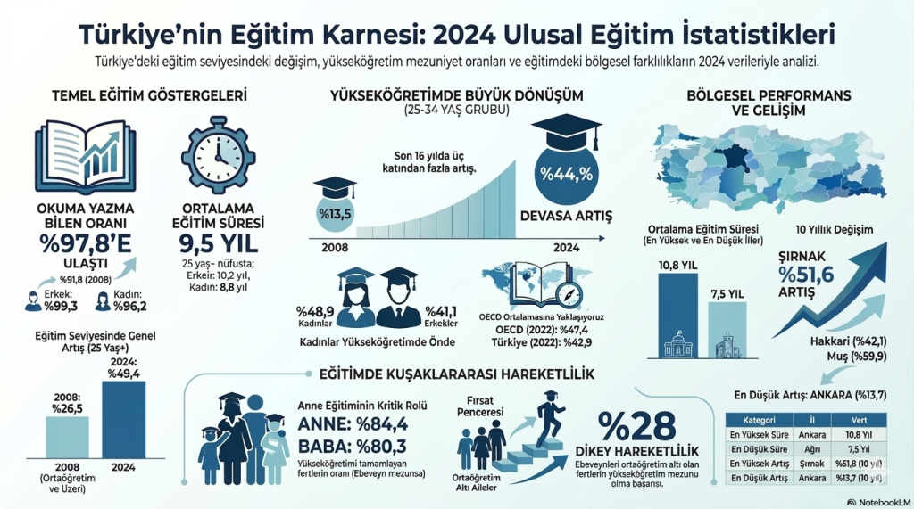 Türkiye’de eğitim seviyesi yükseliyor. 2024 verileri, yükseköğretim mezun oranının arttığını, eğitim süresinin uzadığını ve okuma yazma oranının tam seviyeye ulaştığını gösteriyor.