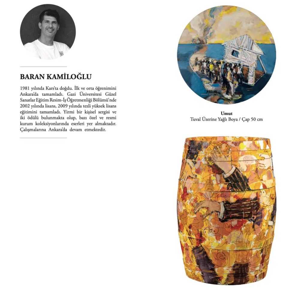 Sanatçının çalışmasında, fırtınalı bir geçiş duygusu hakim. Dairesel tuvaldeki kalabalık hissi, fıçı üzerindeki turuncu ve sarı çizgilerle canlı bir enerjiye ve içsel bir dirence dönüşüyor.